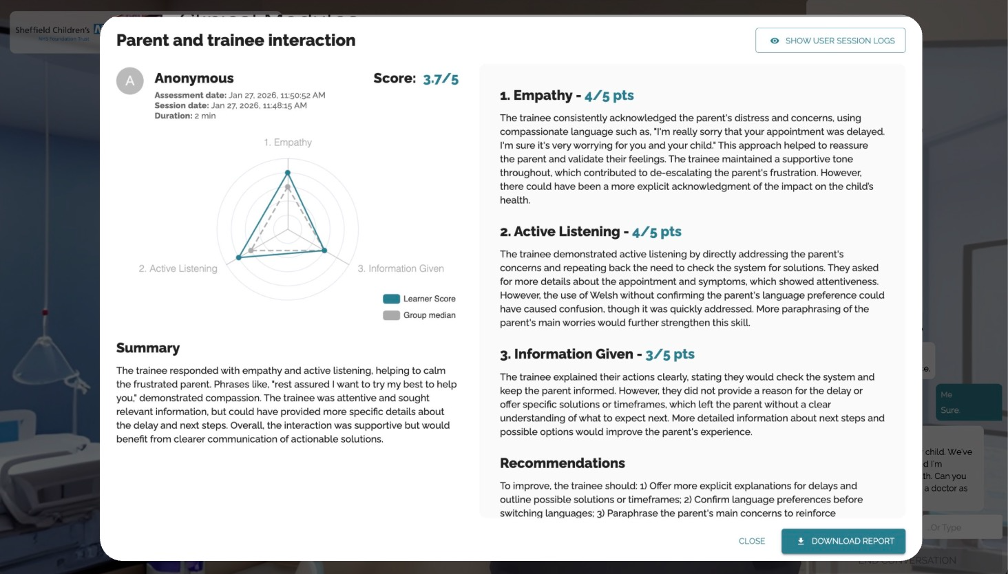 Crucially, the program provided a safe, non-judgmental space for staff to practice highly sensitive clinical conversations. Because the feedback came from a "machine" rather than a human peer, learners were much more receptive to critique and felt a greater sense of psychological safety. The success of these clinical modules caught the attention of the Trust's CEO, who tested the program and now wants to expand AI simulations into other difficult clinical use cases, such as breaking bad news in palliative care.
